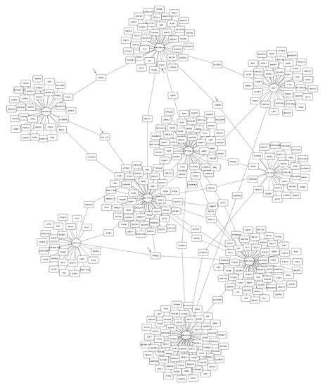 - Shannon, P.; Markiel, A.; Ozier, O.; Baliga, N.S.; Wang, J.T.; Ramage, D.; Amin, N.; Schwikowski, B.; Ideker, T. Cytoscape: A software environment for integrated models of biomolecular interaction networks. Genome Res. 2003, 13, 2498–2504. [Google Scholar] [CrossRef]