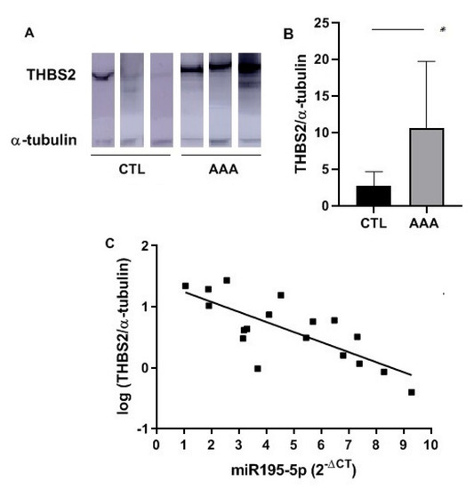Expression levels of THBS2 in tissue samples of AAA patients and organ donors (CTL) quantified by Western Blot. (A) Bands obtained in Western blot analysis of THBS2 in AAA and CTL tissue samples (representative image of three samples of each group); (B) Bar graph of expression levels of THBS2 in tissue specimens of AAA (n = 11) and CTL (n = 7) group calculated as a relative expression using α-tubulin for normalization; (C) Correlation of log (THBS2/α-tubulin) levels and miRNA-195-5p (2−∆Ct) expression in tissue samples (n = 18, CTL and AAA). *, p < 0.05.