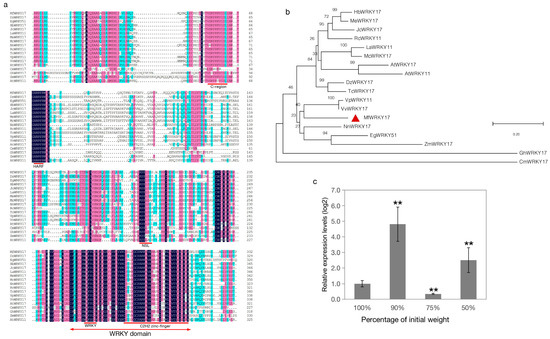 Sequence analysis and expression level of MfWRKY17. (a) Multiple alignment of deduced amino acid sequences; (b) Phylogenetic tree constructed using the neighbor-joining method, with the Jones–Taylor–Thornton model, Gamma Distribution, and 1000 Bootstrap replications. The details (sequence name: acceesion no., species) for sequences used were DzWRKY17: XP_022731890, Durio zibethinus; EgWRKY51: XP_010929316, Elaeis guineensis; HbWRKY17: XP_021671615, Hevea brasiliensis; JcWRKY17: XP_012076351, Jatropha curcas; LaWRKY11: AGZ01975, Luffa aegyptiaca; MeWRKY17: XP_021597536, Manihot esculenta; McWRKY17: XP_022141783, Momordica charantia; NnWRKY17: XP_010265415, Nelumbo nucifera; RcWRKY11: XP_002515353, Ricinus communis; TcWRKY17: XP_007011614, Theobroma cacao; VpWRKY11: AFV70622, Vitis pseudoreticulata; VvWRKY17: XP_002262775, Vitis vinifera; AtWRKY17: AT2G24570.1, Arabidopsis; AtWRKY11: At4G31550.1, Arabidopsis; ZmWRKY17: ACG39023.1, maize; GhWRKY17: ADW82098.1, cotton; CmWRKY17: AJF11725.1, Chrysanthemum. Conserved domain or motif was marked by the red line; NLS, nuclear localization signal. (c) Expression levels of MfWRKY17 during dehydration treatment. Asterisks indicate significant difference (** p = 0.01) compared to the fully hydrated control (100% of initial weight).