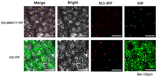 Subcellular localization of MfWRKY17. The constructs 35S::YFP and 35S::WRKY17-YFP were co-expressed with the nucleus marker NLS-RFP in N. benthamiana via Agrobacterium-mediated infiltration. YFP, yellow fluorescence protein; RFP, red fluorescence protein.