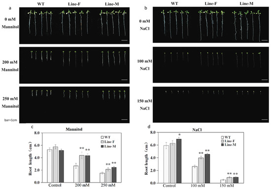 The performance of seedlings of transgenic Line-F and Line-M, and WT control was monitored under salt and osmotic stresses. Under normal condition, the seedling growth of transgenic lines and WT was similar. However, under the presence of 200 mM and 250 mM mannitol, WT seedlings exhibited more severe growth inhibition than those of transgenic seedlings (Figure 3a). Similar results were also obtained in the presence of 100 and 150 mM NaCl (Figure 3b). The root length did not significantly differ between the transgenic lines and WT plants under non-stress conditions. However, under the treatments of 200 mM and 250 mM mannitol, and 100 mM and 150 mM NaCl, the MfWRKY17 overexpression lines showed longer primary roots than those of WT control plants (Figure 3c,d).