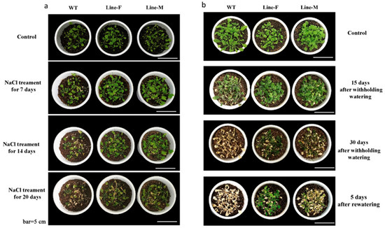Morphological responses of wild-type (WT) and transgenic lines to salt (a) and drought treatments (b).