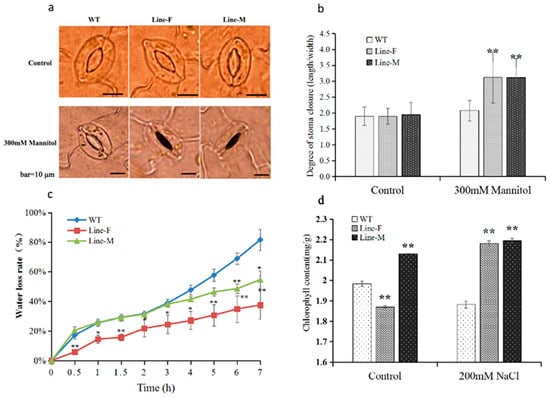 We evaluated the abilities of water retention under stressful conditions. Under normal conditions, the stomatal aperture index (ratio of length/width of stomatal aperture) of WT plants was 1.8, and those of Line-F and Line-M plants were 1.8 and 1.9, respectively. After mannitol treatment, the stomatal aperture indices of Line-F and Line-M increased to 3.1 and 3.0, respectively, which were significant higher than that of WT (Figure 5a,b). Consistent with this result, Line-F showed significantly lower water loss rate than that of WT during the whole treatment process. Line-M showed similar water loss rate with WT at early stage of treatment. However, after 4 h, the water loss rate of WT increased faster than that of Line-M (Figure 5c).