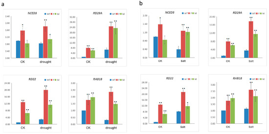 Expression levels of stress-responsive genes in wild-type (WT) and transgenic lines under drought (a) and salt (b) treatments. Y-axis showed the relative expression levels under normal (CK), drought, and salt treatments. ACT2 gene was used as the internal control. Asterisks indicated significant difference (* p < 0.05, ** p < 0.01, by independent sample T-test) compared to WT.