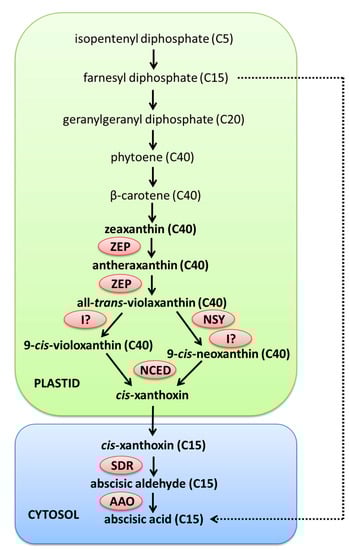 The biosynthesis of abscisic acid (ABA) in higher plants occurs via an indirect pathway (marked with solid, black arrows) and is initiated from the cleavage of β-carotene (C40). Initial steps in ABA biosynthesis occur in plastids, while final reactions take place in cytosol. In a direct pathway (marked with dashed, black arrow), which occurs in some fungi, ABA synthesis starts with the β-carotene precursor farnesyl diphosphate (C15). ZEP, zeaxanthin epoxidase; NSY, neoxanthin synthase; I?, unknown isomerase; NCED, 9-cis-epoxycarotenoid dioxygenase; SDR, short-chain alcohol dehydrogenase/reductase; AAO, abscisic aldehyde oxidase.