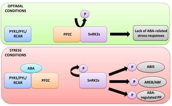ABA perception occurs when the phytohormone binds to the pyrabactin-resistance 1/pyrabactin-resistance-like/regulatory component of ABA receptors (PYR1/PYL/RCAR also referred to as PYLs) protein receptors [31,32], as shown in Figure 2. ABA receptor proteins contain a conserved START (steroidogenic acute regulatory-related lipid transfer) protein domain and thus belong to START protein superfamily [33]. PYLs are well described in Arabidopsis, in which the PYLs family contains 14 members [34]. Contrary to Arabidopsis PYLs, data about cereal ABA receptors are limited. In rice, 13 PYLs orthologues were identified; among them, 10 seem to be functional ABA receptors. Members of the rice PYLs family were differentially expressed in distinct tissues in response to ABA treatment, which suggest their specificity in the ABA signaling pathway and diverse biological function [35,36]. Binding of ABA to PYR1/PYL/RCAR receptors leads to inhibition of a protein phosphatase 2C (PP2C) activity, which in turn activates a sucrose nonfermenting 1 (SNF1)-related protein kinase 2 (SnRK2). Activated by autophosphorylation or other protein kinases, SnRK2 then phosphorylates relevant substrates (transcription factors and proteins), leading to ABA-related physiological responses [32,37]. In the absence of ABA, PP2Cs dephosphorylates SnRK2s, so the inhibition of their kinase activity occurs and the following steps of ABA signaling are consequentially precluded [38]. Recent molecular and genetic studies enabled identification of transcription factors playing a key role in the regulation of ABA-related gene expression under stress, including ABA-responsive element (ABRE)-binding proteins (AREBs), ABRE-binding factors (ABFs), and ABA insensitive 5 (ABI5) [39,40]. In response to stress condition, the ABA signal transduction cascade activates SnRK2s, which then regulate the activity of listed elements, as well as enzymes and phosphoproteins, which could be potential targets for SnRK2s [41].