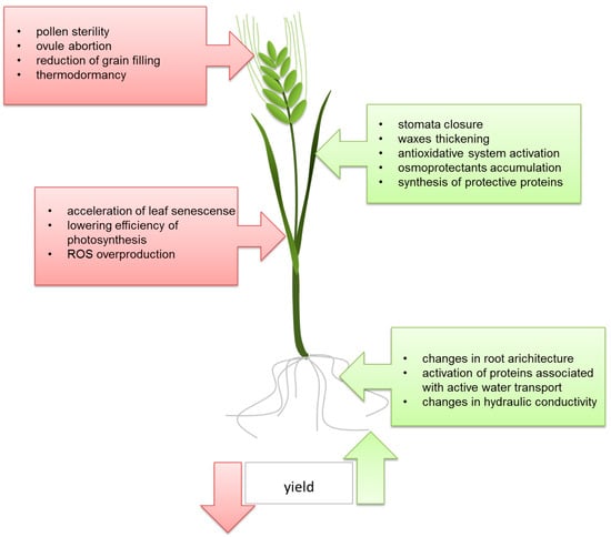 A brief summary of the common physiological changes, including both positive and negative factors, in the response of cereals to abiotic stresses is presented in Figure 3.