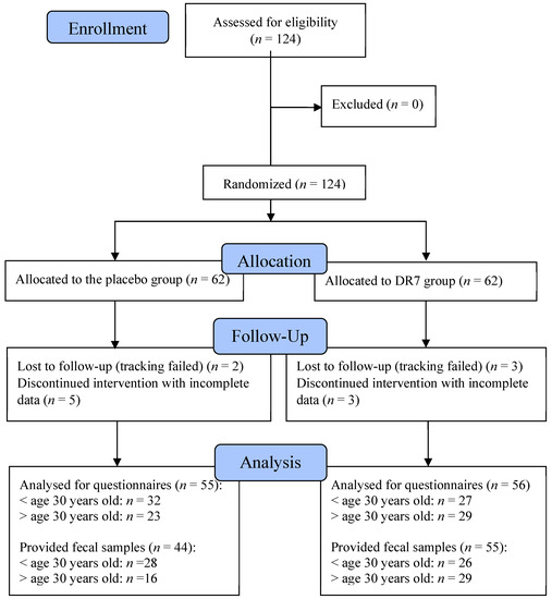As a continuation of a previous study, the general characteristics for all subjects were as previously reported, where the subjects from both groups fulfilled the inclusion criteria of moderately stressed, and insignificant differences were observed in most of the general and demographic characteristics between placebo and DR7 groups [9]. A total of 124 subjects were assessed for eligibility, recruited, and randomized into either the placebo or DR7 group (Figure 1). A total of 13 subjects dropped-out during the 12-weeks period, either due to failure to track or did not comply in answering the gut health questionnaire, yielding a total of 111 subjects (n = 55 for placebo and n = 56 for DR7). No adverse effects were reported. A total of 44 subjects from the placebo group and 55 from the DR7 group provided complete sets of faecal samples, yielding a total of 99 completed faecal sample sets.