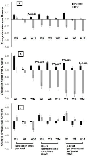 Changes in gastrointestinal clinical outcomes after 12 week administration of Lactobacillus plantarum DR7 compared to the placebo group in (A) all subjects, (B) young adults (aged <30 years old), and (C) normal adults (aged >30 years old). Direct gastrointestinal symptoms included vomiting, dysentery (blood in stool), abdominal pain, nausea, and rectal pain (sharp dull, burning, feels like a hard object in the rectum); indirect gastrointestinal symptoms included loss of appetite, fatigue, dizziness, headache, dehydration, and fever; number of defecation times were calculated based on a weekly basis. p-values indicated the difference between treatment groups at individual time points. Results are expressed as mean, error bars (SEM); n = 111 (DR7 n = 56 and placebo n = 55).