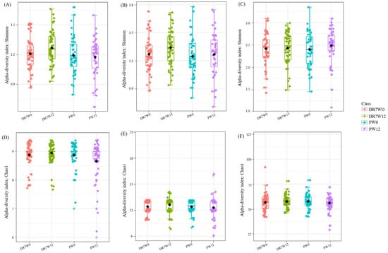 Alpha diversity plots for stressed adults at baseline (W0) and after week-12 (W12), upon administration of Lactobacillus plantarum DR7 or placebo. Diversity measured by Shannon Evenness Index for (A) class (W0: p = 0.264; W12: p = 0.034), (B) order (W0: p = 0.316; W12: p = 0.116), and (C) genus (W0: p = 0.919; W12: p = 0.351), and Chao1 Richness Index for (D) class (W0: p = 0.876; W12: p = 0.005), (E) order (W0: p = 0.781; W12: p = 0.018), and (F) genus (W0: p = 0.416; W12: p = 0.123). The line inside the box represents the median, whereas the whiskers represent the lowest and highest values within the interquartile range. Outliers, as well as individual sample values, are shown as dots. Statistical significance was analyzed using the Mann–Whitney U test. n = 99 (DR7 n = 55 and placebo n = 44).