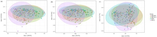 Beta diversity measured by Bray–Curtis dissimilarity and Principal Coordinates Analysis (PCoA) for class (A), order (B), and genus (C) are plotted for stressed adults at baseline (W0) and after week-12 (W12), upon administration of Lactobacillus plantarum DR7 or placebo. Diversity in microbial community composition was achieved by permutational analysis of variance (PERMANOVA) for class, order, and genus. PERMANOVA: class (W0: p = 0.343, W12: p < 0.001), order (W0: p = 0.338, W12: p < 0.001), and genus (W0: p = 0.338, W12: p < 0.001). n = 99 (DR7 n = 55 and placebo n = 44).