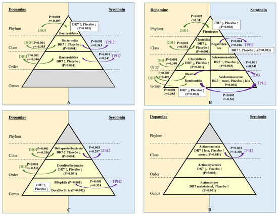 Changes in gut microbiota after 12-week administration of Lactobacillus plantarum DR7 compared to placebo group along the lineage of phylum Bacteroidetes (A) and Firmicutes (B) and classes Deltaproteobacteria (C) and Actinobacteria (D). Only microbiota groups which showed significant changes over 12 weeks between placebo and DR7 groups are shown (as indicated by p-values inside the pyramid; Mann–Whitney U test; ↑ indicates an increase over 12 week and ↓ indicates a reduction over 12 weeks). Curved arrows indicate correlations between gut microbiota and blood gene expressions of dopamine β-hydroxylase (DBH), tryptophan hydroxylase-2 (TPH2), and tryptophan 2,3-dioxygenase (TDO) (p-value and rho (r) obtained from Spearman’s rank correlations. n = 99 for gut microbiota (DR7 n = 55 and placebo n = 44); n = 111 for blood gene expressions (DR7 n = 56 and placebo n = 55).