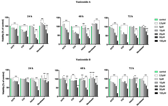 Fibroblasts appeared to be the least sensitive for vanicoside A among the tested cell lines. Fibroblast viability was severely affected only at higher concentrations of vanicoside A, 50 and 100 µM (80% and 58% cell viability, respectively, without significant difference among incubation times). Moreover, cell viability increased when fibroblasts were exposed to vanicoside A at low doses (2.5–25 µM) for 24 and 48 h. After 24 h, the highest cell viability (120%) was observed following exposure to 2.5 µM, and after 48h following exposure to 10 µM (116% cell viability).