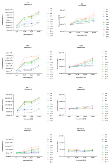 Cells were seeded in 50 µL growth medium in white 96-well microtiter plates at the concentration of 1 × 104 cells/well. A set of control wells without cells present (growth medium only) to determine background luminescence and background fluorescence was included. The appropriate dilution of vanicoside A (or B) was prepared in growth medium at 4× the desired final concentration. A set of control wells without a vanicoside present (untreated controls) was included. An amount of 50 µL of the vanicoside A (or B) dilution was added to the appropriate wells in the 96-well assay plate. Then, 100 µL of 2× concentrated RealTime-Glo™ Annexin V Apoptosis and Necrosis Detection Reagent in growth medium was added to each well. Cells were incubated in a covered 96-well assay plate at 37 °C/5% CO2 in a humidified cell culture incubator. Luminescence and fluorescence (Ex 475, Em 500–550) on the GloMax® Discover instrument (Promega, Madison, WI, USA) using the RealTimeGlo™ Annexin V Apoptosis Assay pre-programmed protocol at 2, 4, 6, 8, 10, 12, 14, 16, 18, 20, 22 and 24 h were measured.
