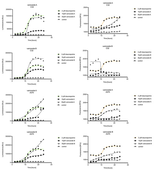 After exposure of the C32 cell line to vanicoside B, a marked enhancement in luminescence was observed between 8 and 10 h and was maximized at 16 h. The luminescence signal was even stronger for vanicoside B than for vanicoside A, but the fluorescence signal was significantly different. For high doses of vanicoside B (25 and 50 µM), the high level of fluorescence was visible from the first measurement, 2 h, and there was no decrease until 10 h, reaching the level close to the control value after 24 h. For the low dose (10 µM), the fluorescence signal grew slightly from 2 h until 10–14 h: after that time, it decreased to the control value. Although the annexin V fusion protein binds to exposed phosphatidylserine, no increase in fluorescence due to secondary necrosis was observed during 24 h incubation.