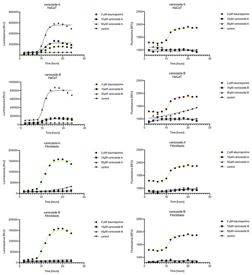 Real-time monitoring of luminescence (A) and fluorescence (B) signals measured for HaCaT and fibroblast cell lines treated with 10 and 50 µM of vanicoside A and vanicoside B over 24 h, reported in relative luminescence units (RLU) and relative fluorescence units (RFU), respectively. Staurosporine (2 µM) was used as the positive control–an apoptosis-inducer. The term “control” means cell lines without treatment of vanicosides. Negative control for staurosporine was not presented.