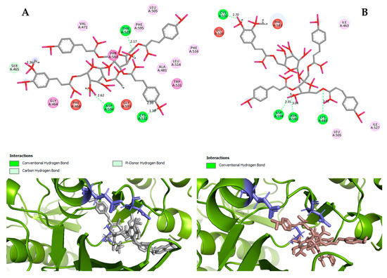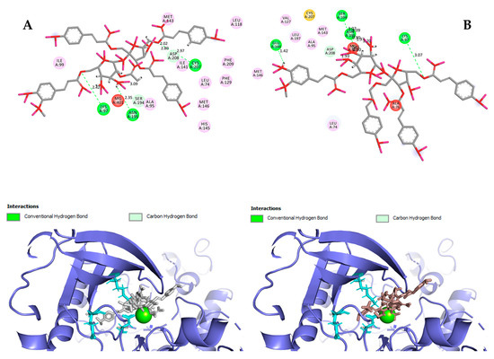 2D and 3D interactions of vanicoside A (A) and vanicoside B (B) with the B-Raf kinase.