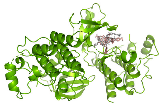 B-Raf kinase (PDB ID: 3OG7) in complex with vanicosides A (gray) and B (pink).