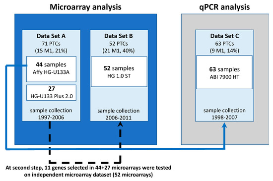 Our study included material, longitudinally collected intraoperatively at our center. The sample collection lasted several years, and several attempts to perform the analysis were made during the time. Simultaneously, microarray technology was developing, so the data obtained in different timepoints show a batch effect due to different reagent batches and—in part—different microarray batches and generations. Initially, the planned analysis included independent discovery and validation sets (microarrays and qPCR, respectively) (Figure 1). As the results of the initial discovery cohort analysis showed weak discrimination and validation results were inconclusive, we extended the microarray analysis to also cover the samples preliminarily used for qPCR (Dataset A). Later on, an additional dataset was collected and analyzed (Dataset B). The first set of PTC tumors was analyzed in 2005 using the HGU 133A arrays. The next set was subsequently collected and analyzed in 2009, when the previous arrays were no longer available. Thus, we used HGU133 2.0 PLUS arrays. After the second analysis, our results were still inconclusive. So, in 2014, we analyzed the third set of samples using a new generation of microarrays. The use of different platforms required careful analysis. Therefore, we decided to combine all the sets.