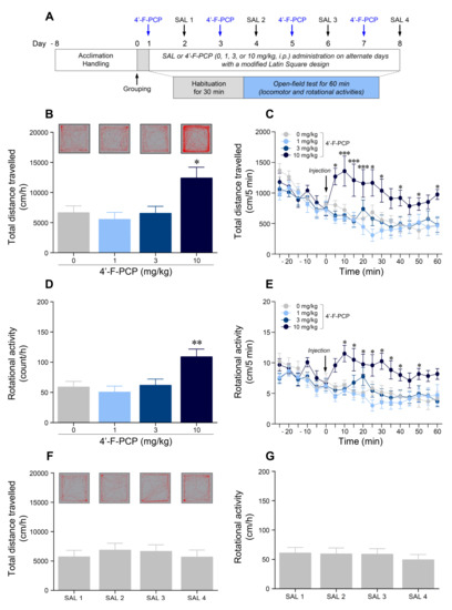 Effects of 1-(1-(4-fluorophenyl)cyclohexyl)piperidine (4′-F-PCP) on locomotor and rotational activities in mice. (A) Experimental timeline for open-field test of 4′-F-PCP. (B,C) Representative locomotion tracking patterns (red lines in each gray rectangle) and total distance travelled over 60 min, and temporal changes in distance travelled after administration of 4′-F-PCP (0, 1, 3, or 10 mg/kg, i.p.). (D,E) Total rotational activity over 60 min and temporal changes in rotational activity after administration of 4′-F-PCP (0, 1, 3, or 10 mg/kg, i.p.). (F,G) Representative locomotion tracking patterns with total distance travelled and rotational activity for 60 min after the administration of saline on the other alternate days. Asterisk *, **, and *** indicates p < 0.05, p < 0.01, and p < 0.001, respectively, vs. 0 mg/kg 4′-F-PCP group. SAL: saline. n = 12 per group.