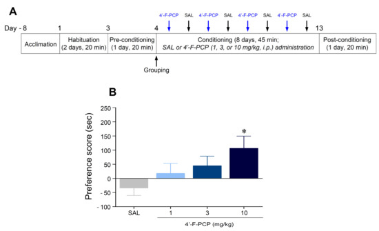 Effect of 4′-F-PCP on conditioned place preference (CPP) in mice. (A) Experimental timeline for CPP test of 4′-F-PCP. (B) Effect of 4′-F-PCP (1, 3, or 10 mg/kg, i.p.) on place preference. Asterisk * indicates p < 0.05 vs. saline-conditioned group. SAL: saline. n = 12 per group.