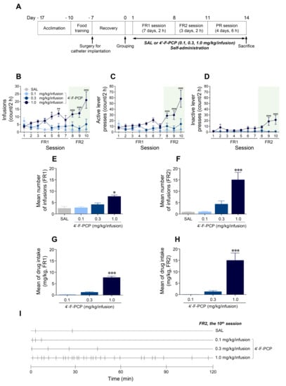 Effects of 4′-F-PCP on self-administration under fixed ratio (FR) schedule in rats. (A) Experimental timeline for 4′-F-PCP self-administration under FR and progressive ratio (PR) schedules of reinforcement. (B–D) Temporal analysis of mean number of infusions, active lever presses, and inactive lever presses during a 2 h session under FR1 and FR2 schedules. (E,F) Mean of total number of infusions for a 2 h session under FR1 and FR2 schedules. Asterisks *, **, and *** indicate p < 0.05, p < 0.01, and p < 0.001, respectively, vs. saline self-administered group. (G,H) Mean of intake amount of 4′-F-PCP for a 2 h session under FR1 and FR2. Asterisks *** indicate p < 0.001 vs. 0.1 and 0.3 mg/kg/infusion 4′-F-PCP group. (I) Representative hatchmarks indicate the infusion patterns of saline and 4′-F-PCP at the final self-administration session of FR2 schedules. SAL: saline. n = 6 per group.