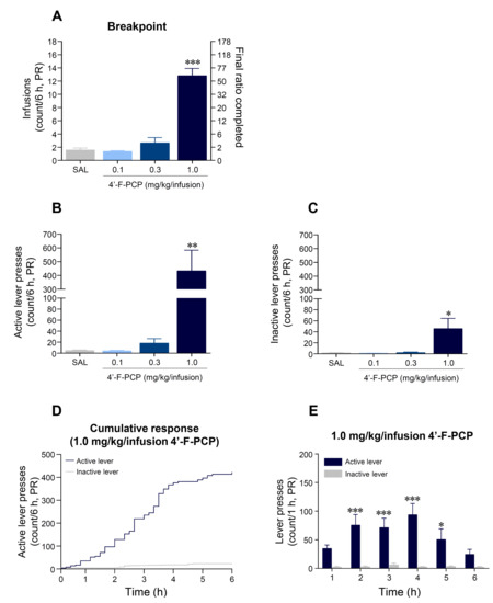 The reinforcing strength of 4′-F-PCP self-administration under the progressive ratio (PR) schedules in rats. (A) Breakpoint of saline and 4′-F-PCP (0.1, 0.3, or 1.0 mg/kg/infusion) during 6 h under the PR sessions (Day 11–14). Left y-axis and right y-axis indicate the mean of drug infusions and final ratio completed to access saline or 4′-F-PCP for 4 days of PR schedule, respectively. (B,C) Mean number of active and inactive lever-pressing responses of saline or 4′-F-PCP-self-administration under the PR schedules. (D) Representative plots for cumulative active and inactive lever responses at 1.0 mg/kg/infusion 4′-F-PCP-self-administering rats during the final session of PR schedule. (E) Temporal analysis of active and inactive lever responses at the final session of PR schedule of 1.0 mg/kg/infusion 4′-F-PCP-self-administered rats. Asterisk *, **, and *** indicate p < 0.05, p < 0.01, and p < 0.001, respectively, vs. inactive lever. SAL: saline. n = 6 per group.