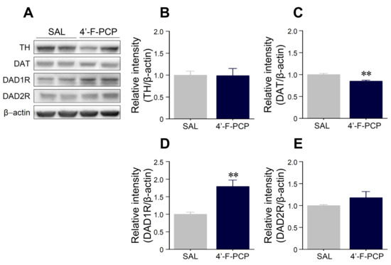 Effect of 4′-F-PCP on the immunoreactivities of dopamine-related proteins in the nucleus accumbens (NAc) of 4′-F-PCP-self-administered rats under the PR schedules. (A–E) Immunoreactivities of TH, DAT, DAD1R, and DAD2R proteins in the NAc after saline or 1.0 mg/kg/infusion 4′-F-PCP self-administration under the PR schedules of reinforcement. Asterisks ** indicate p < 0.01 vs. saline controls. SAL: saline. n = 4–6 per group.