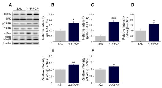 Effect of 4′-F-PCP on the immunoreactivities of pERK, pCREB, c-Fos, and FosB/ΔFosB proteins in the NAc of 4′-F-PCP-self-administered rats under the PR schedule. (A–F) Immunoreactivities of pERK, pCREB, c-Fos, and FosB/ΔFosB proteins in the NAc after saline or 1.0 mg/kg/infusion 4′-F-PCP self-administration under the PR schedules of reinforcement. Asterisks *, **, and *** indicate p < 0.05, p < 0.01, and p < 0.001, respectively, vs. saline controls. SAL: saline. n = 4–6 per group.