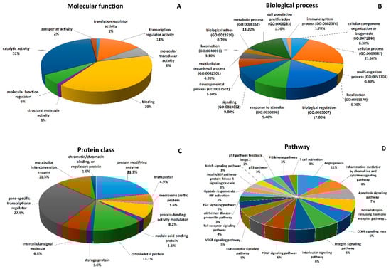 Gene ontology enrichment analysis of target genes of down-regulated miRNA clusters. (A) Classification according to the molecular function of genes, (B) classification according to biological processes in which target genes are involved, (C) classification according to protein class and (D) classification according pathways used in target gene signalling (first 20 most abundant pathways are plotted).