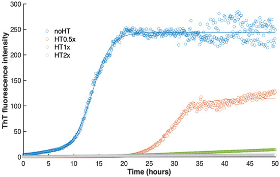 At first, the effect of HT on insulin amyloid formation was evaluated by ThT binding assay. ThT is an amyloid specific dye as it shows a strong fluorescence emission only when bound to the cross-β amyloid structure [47,48]. Figure 2 reports the amyloid aggregation kinetics of human insulin in the absence and in presence of HT (0.5×, 1×, 2×) evaluated by ThT assay.