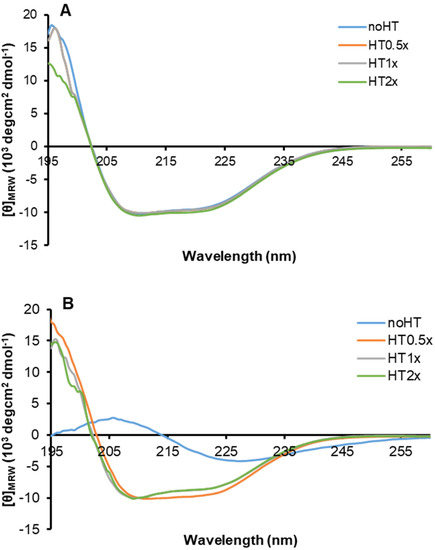 In order to monitor the effect of HT on the structural transition underlying amyloid formation in human insulin, far-UV CD spectra of the protein in the absence and in the presence of HT (0.5, 1 and 2x) were recorded at 0 and 24 h of incubation in aggregating conditions (Figure 3).