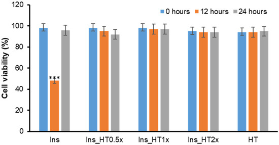 Further confirmation of HT inhibition in insulin amyloid formation was obtained by cellular toxicity studies. Indeed, amyloid aggregates are known to affect cell toxicity. In particular, it is well-established that the most toxic amyloid species are the early soluble oligomeric aggregates whereas amyloid fibrils are essentially harmless [37,38,39,49,50]. Furthermore, for insulin, the higher cytotoxicity is associated with the oligomeric species, formed at 12 h in our aggregation conditions and poorly ThT-reactive, while amyloid fibrils (formed at 24 h), which are highly ThT-reactive, are almost harmless [34]. To assess the cytotoxicity of insulin species formed in the presence of HT in aggregating conditions, the cell viability was evaluated in neuroblastoma cells by the MTT assay, which measures the cellular metabolic activity (Figure 4). To this aim, SH-SY5Y cells were exposed for 24 h to insulin incubated for 0, 12 and 24 h in aggregating conditions in the presence of different concentrations of HT (0, 0.5, 1, 2×). As previously observed, in the absence of HT, early amyloid aggregates (12 h) reduce cell viability by approximately 50% compared to untreated cells, while amyloid fibrils (24 h) are not toxic [34,46]. Interestingly, insulin samples aggregated in the presence of HT showed no cell toxicity at any incubation time thus indicating the absence of amyloid oligomeric species in these samples. The sample incubated in the presence of 0.5x HT was not showing cytotoxicity either at 12 and 24 h incubation and this could be due to a low concentration of toxic oligomeric species at these time points, as suggested by the low ThT reactivity. These data clearly show that the presence of an equimolar amount HT does not promote the formation of soluble cytotoxic species in human insulin, thus suggesting that HT could have a protective effect in amyloid toxicity.