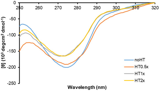Effect of HT on insulin oligomerization state monitored by near-UV CD spectroscopy. Near-UV CD spectra of insulin in the absence and in the presence of HT in a 0.5, 1, and 2× molar ratio. Protein concentration was 2.0 mg/mL, other experimental details are described in the Methods section.