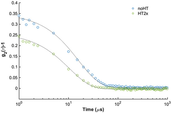 Effect of HT on insulin oligomerization state monitored by dynamic light scattering (DLS). Second order autocorrelation functions g2 (τ) measured for 2 mg/mL, pH 7.0 insulin incubated in the absence (blue) and in the presence (green) of HT in a 2× molar ratio. Continuous lines are the best fit to single exponential functions as described in Equation (1).