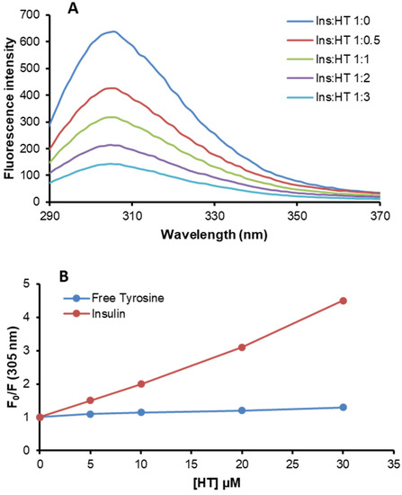 Insulin-HT interaction monitored by fluorescence spectroscopy. (A) Tyrosine fluorescence emission was evaluated in both insulin and free tyrosine after addition of HT at different molar ratios (1:0, 1:0.5, 1:1, 1:2, 1:3). (B) Stern–Volmer plot of tyrosine quenching by HT. Working concentrations were 10 µM for insulin and 40 µM for free tyrosine. Other experimental details are described in the Methods section.