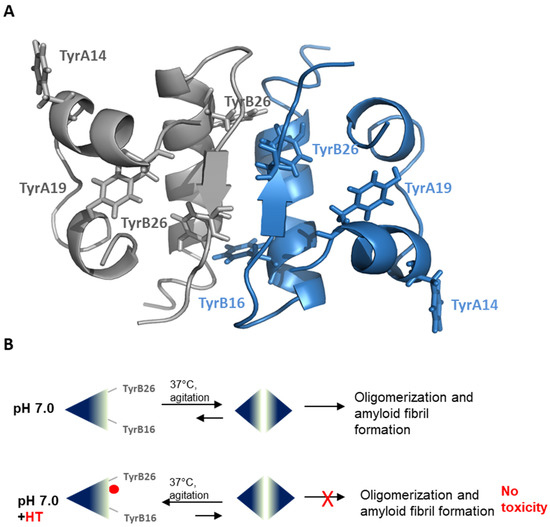 Working hypothesis for HT inhibition in insulin amyloid formation. (A) Structural representation of human insulin in its dimeric form (PDB code 3AIY). The two monomers are represented in gray and light blue and tyrosine residues are represented in the tridimensional structure for each monomer. (B) Schematic representation of the effect of HT on insulin amyloid formation.
