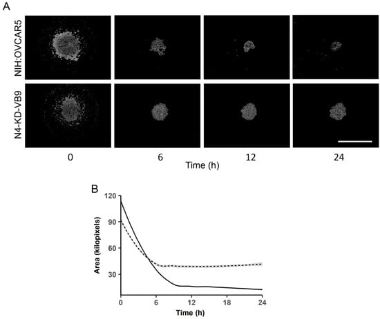 For the time-lapse experiments reported herein, we used round-bottom ultra-low attachment plates to monitor the spheroid formation at early time points and over an extended period of time, using time-lapse photography in IncuCyte® instruments. In the round-bottom plates, NIH:OVCAR5 cells gravitated to the center of the wells and then formed a single, tightly compacted spheroid within 8 h. In contrast, the spheroids formed from N4-KD-VB9 cells in the round-bottom plates were slower to form the initial cell–cell attachments and the spheroids formed by 24 h were not as tightly compacted as the parental NIH:OVCAR5 cells. In the case of the cells treated with peptide N4-P10, multiple small aggregates formed in the round-bottom wells, which, after 24 h, encompassed an area that remained larger than the control spheroids.
