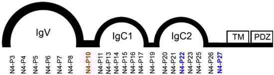 Peptides of 14 amino acids in length from the extracellular domain of Nectin-4 and scrambled-sequence control peptides were synthesized by Aapptec (Louisville, KY, USA) as previously described [15]. A scrambled version of peptide N4-P10 was used as a control peptide and is called N4-P10S. The amino acid sequences of the peptides are listed in Table 1. All the peptides were synthesized with a free amino terminus and an amide at the carboxy terminus, purified by high-pressure chromatography, and the sequences were verified by mass spectrometry to be >95% pure. The peptides were dissolved in dimethyl sulfoxide (DMSO; Sigma-Aldrich, St. Louis, MO, USA) at a concentration of 50 mg/mL, aliquoted, and stored at −80 °C.