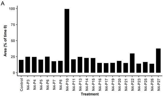 Screening of twenty-one peptides from the extracellular domain of Nectin-4 for their ability to inhibit spheroid formation. Each of the Nectin-4 peptides (at 150 µg/mL final concentration) were added to 96-well round-bottom ultra-low attachment plates followed by the NIH:OVCAR5 cells. The cells were monitored for spheroid formation in the IncuCyte® Zoom instrument and the size of the spheroids was measured. DMSO was used as the negative control. (A) Spheroid area is represented as a percentage of the area at 24 h over the area at the time of the initial measurements (t = 0). (B) Photographs of the NIH:OVCAR5 cells over a 24 h time period in the presence of DMSO (control), or peptides N4-P10, N4-P22, and N4-P14. Bar = 800 µm. The initial photographs (t = 0) were taken 10–25 min after the cells were plated, at which time the cells had gravitated to the bottom of the well and were initiating cell–cell attachments. Spheroid formation was complete after 24 h. Time-lapse videos corresponding to these figures are included as Supplemental videos S3–S6.