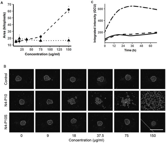 NIH:OVCAR5 cells were added to wells containing from 9 to 150 µg/mL of peptide N4-P10 or peptide N4-P10S, or DMSO control, and then the formation of spheroids was monitored via the IncuCyte® Zoom instrument. The resulting footage was analyzed with the CellProfilerTM pipeline described below.