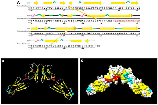 Molecular models showing the location of peptide N4-P10 in Nectin-4. The crystal structure of the IgV and IgC1 extracellular domains of human Nectin-4 were present in the Research Collaboratory for Structural Bioinformatics (RCSB) Protein Data Bank (PDB) (www.rcsb.org) as PDB ID: 4FRW [18] (A) The sequence chain view of the IgV and IgC1 domains modified from an image of Nectin-4 in the RCSB PDB, in which the amino acid sequence for the peptide N4-P10 is highlighted in red. Yellow arrows: beta strand; brown arrowheads: beta bridge; green loops: bend; pink loops: 3/10-helix; gold lines: cysteine bridges. (B) A 3-dimensional ribbon model of the dimerized IgV and IgC1 domains of Nectin-4. (C) A 3-dimensional surface model of the dimerized IgV and IgC1 domains of Nectin-4. In (B) and (C), the peptide N4-P10 is colored red, while the regions with structures are colored yellow (strands), blue (alpha-helix), and white (coil). The resolution of the original crystallographic study was between 20 and 3.5 angstroms, and the dimer interface shown in (B) and (C) is ~ 680 square angstroms [18].