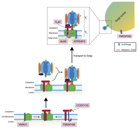 Schematic overview of the mammalian V-ATPase and the putative model of its assembly. Lowercase letters denote the various subunits of the V0-domain; uppercase letters denote the subunits of the V1-domain. The assembly factors VMA21, TMEM199, and CCDC115 might assemble the membrane-associated V0-domain of the V-ATPase. VMA21 interacts with V0c’ and V0a [79,80,81,82], TMEM199 and CCDC115 interact with V0a [83]. Abbreviations: V-ATPase, vacuolar H+-ATPase; CDG, congenital disorder of glycosylation.