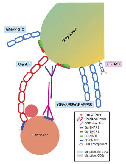 - Witkos, T.M.; Lowe, M. Recognition and tethering of transport vesicles at the Golgi apparatus. Curr. Opin. Cell Biol. 2017, 47, 16–23. [Google Scholar] [CrossRef]