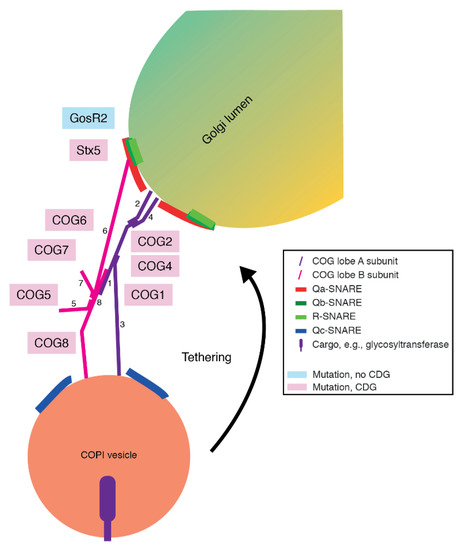 - Shestakova, A.; Zolov, S.; Lupashin, V. COG Complex-Mediated Recycling of Golgi Glycosyltransferases is Essential for Normal Protein Glycosylation. Traffic 2006, 7, 191–204. [Google Scholar] [CrossRef]