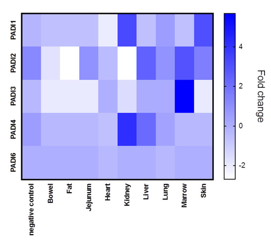PRJNA631753 samples were analysed according to fold-change for PADI1, PADI2, PADI3, PADI4 and PADI6 mRNA levels. Average data from different tissue types are presented with a heat map. Lung and heart samples were from 5 different cases, alongside normal lung samples (“negative control”), with at least 3 replicate biopsy results. The bowel, kidney and liver data were from 2 cases. The data given for fat, jejunum, marrow and skin tissues were from one case. Heat map metric is given as blue bar between normalised mRNA levels.