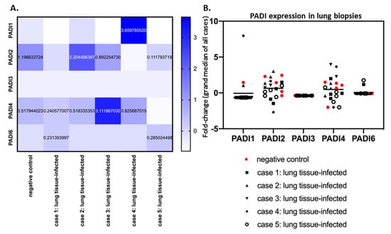 PADI 1-6 isozyme expression levels in SARS-CoV-2-infected lung biopsies, and control lung tissue. (A) PRJNA631753 Bioproject data were analysed according to fold change for PADI1, PADI2, PADI3, PADI4 and PADI6 mRNA levels. Average data from control and SARS-CoV-2-infected lung tissue types are presented with a heat map. (B) The fold change for mRNA expression levels for each PADI is presented for each case and replicate via grand median distribution of data. Negative control (normal lung samples) and SARS-CoV-2 lung samples were from 5 different cases, with at least 3 replicate biopsy results for lung tissue.