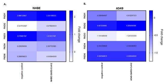 PRJNA615032 BioProject data was analysed for fold change expression for PADI mRNA levels in SARS-CoV-2-infected cell lines, compared with mock. (A) NHBE (human bronchial epithelial) cell lines; (B) A549 (adenocarcinoma human alveolar basal epithelial) cell lines. Heat map metric is given as blue bar between normalised mRNA levels; negative control represents the mock.