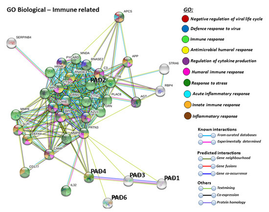 Biological GO (gene ontology) pathways for all human PAD isozymes, relating to immunity. Immune related GO biological pathways are highlighted for protein–protein interaction networks of binding partners with all PAD isozymes (PAD 1,2,3,4,6) as a group. Colour code for the different pathways is shown within the figure. Individual coloured lines represent specific protein interactions that have been identified through interactions that are known (referring to experimentally determined connections and curated databases), through interactions that are predicted (referring to gene fusion, gene neighbourhood, gene co-occurrence) or through interactions identified via text mining, co-expression or protein homology (please refer to the colour key provided in the figure for the different connective lines) (PPI enrichment p-value: < 1.0 × 10−16).