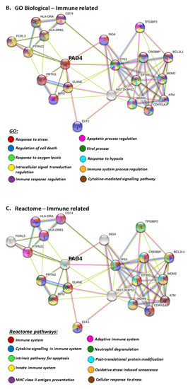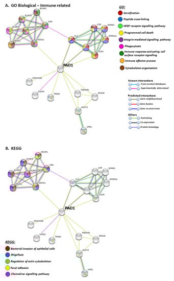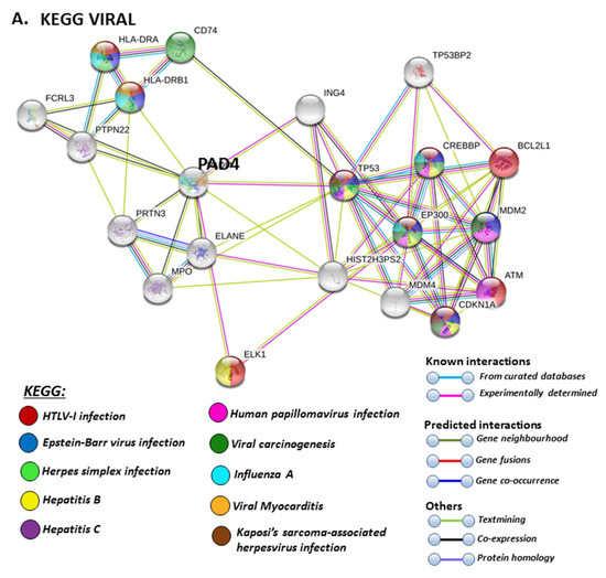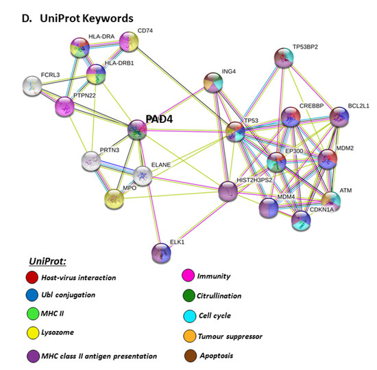 For the prediction of the protein–protein interaction networks of the PAD isoforms under study, the Human PAD protein IDs were submitted to Search Tool for the Retrieval of Interacting Genes/Proteins (STRING) analysis (https://string-db.org/), and analysed for Gene Ontology (GO) and Kyoto Encyclopaedia of Genes and Genomes (KEGG) pathways. When assessing GO biological pathways for all PADs as a group, significant protein–protein interaction networks were observed, with binding partners related to viral life cycle regulation, viral defence responses, and humoral, innate, acute and inflammatory immune responses, including antimicrobial immune responses, stress response and the regulation of cytokine production (Figure 4).